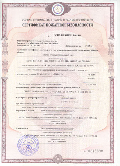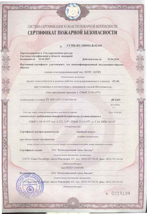 - Сертификат пожарной безопасности на клапаны огнезадерживающие КОЗК