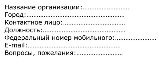 Подробную информацию об условиях сотрудничества, а так же запросить коммерческое предложение можно, позвонив по телефону 8-(800)-100-40-28 (звонок по России бесплатный) или направив запрос на megador@mail.ru, прилагая к письму заполненную ниже форму: