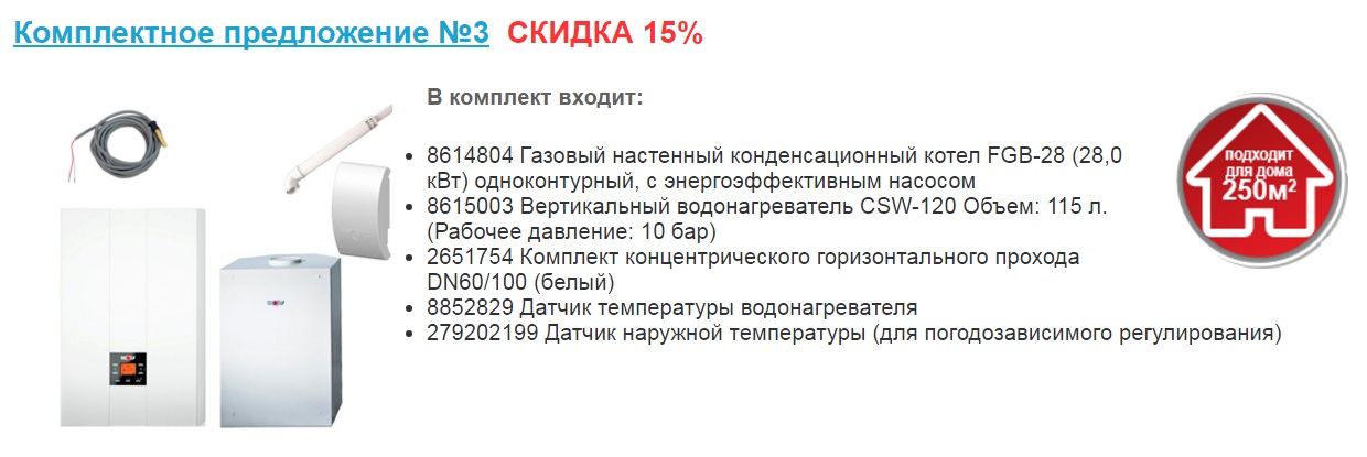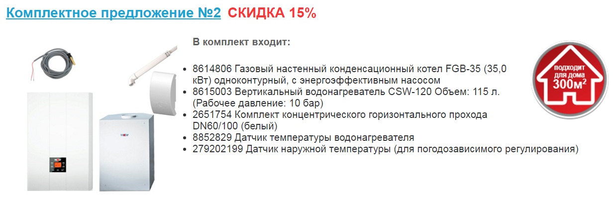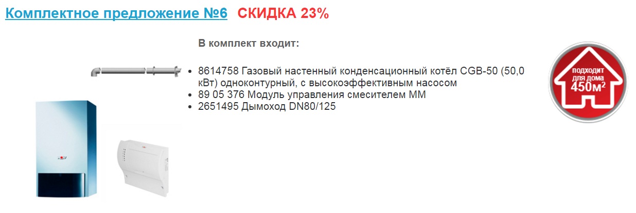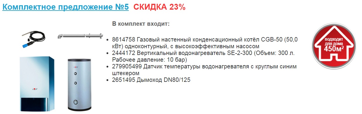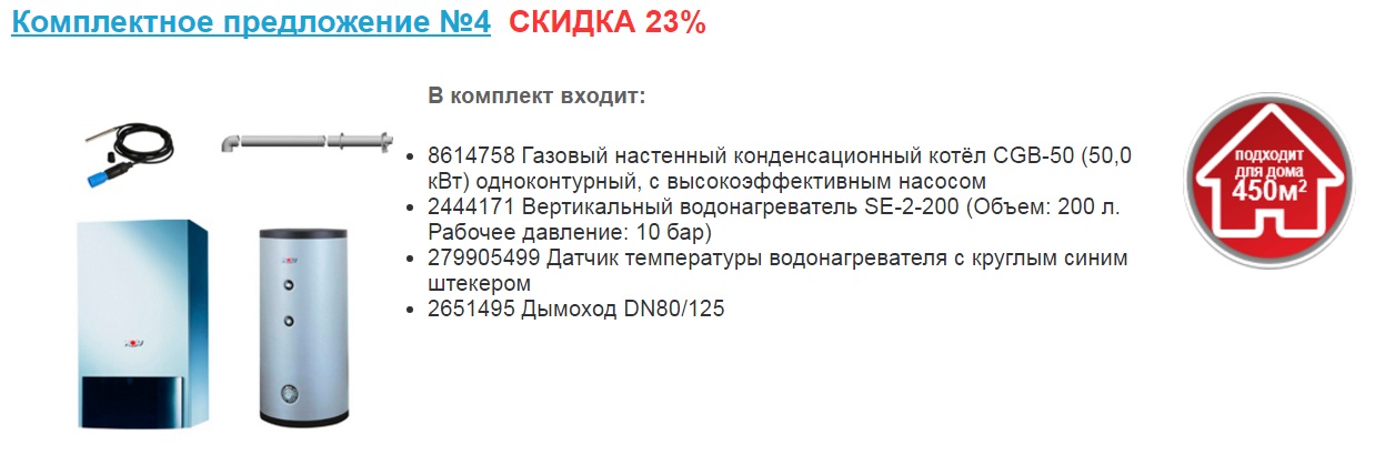 Приобретая настенный или напольный котел, к которому в комплекте идет дымоход, датчик и/или водонагреватель (каждый комплект уникален), покупатель экономит до 60 000 рублей.