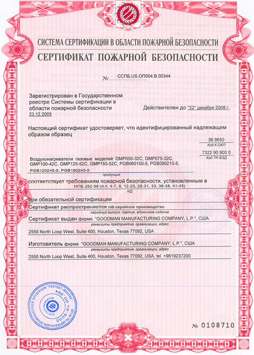Goodman - Сертификат пожарной безопасности № ССПБ.US.ОП004.В.00344 (лицевая сторона)