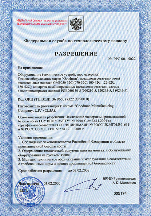 Goodman - Сертификат соответствия № РОСС US.МГ01.ВО1661