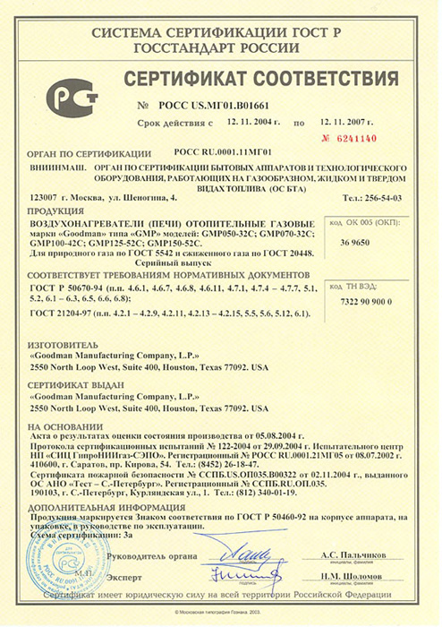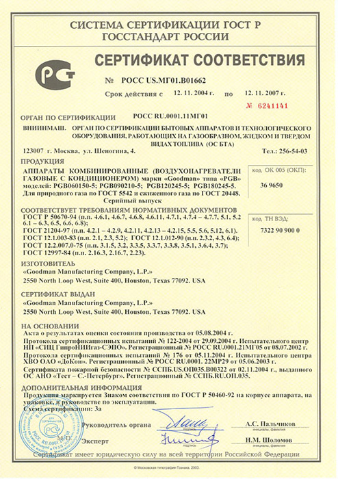 Goodman - Сертификат соответствия № РОСС US.MГ01.B01662