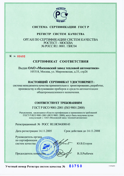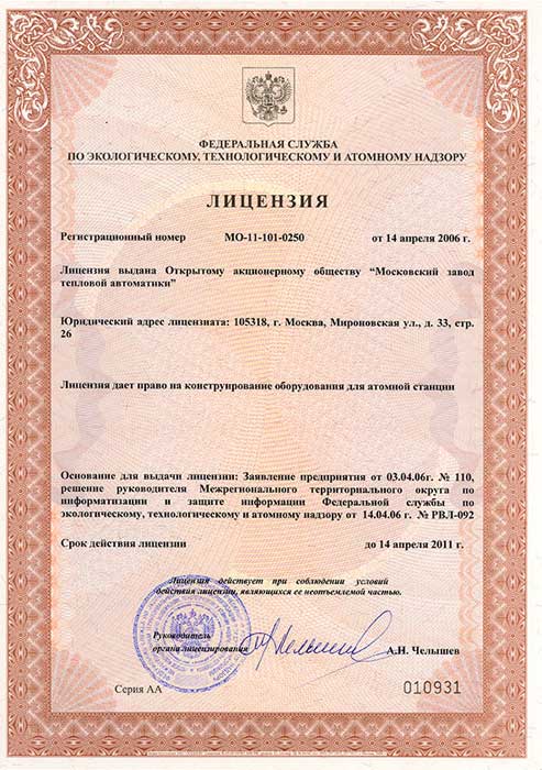 Лицензии и сертификаты компании Московский Завод Тепловой Автоматики