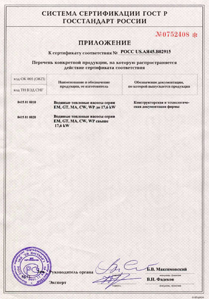 Тепловые насосы FHP - Cертификат соответствия № РОСС US.АЯ45.В02915