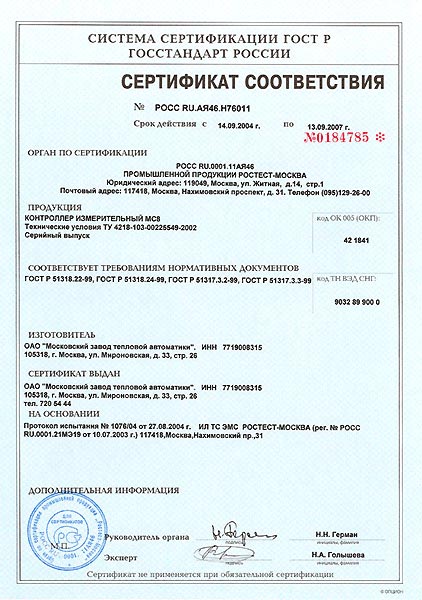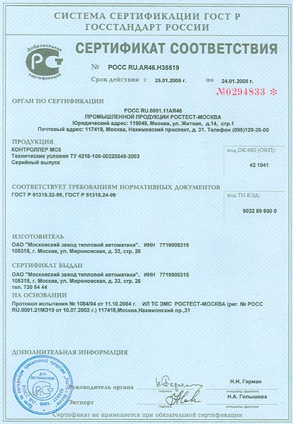 Сертификат соответствия Госстандарта России на контроллер MC5