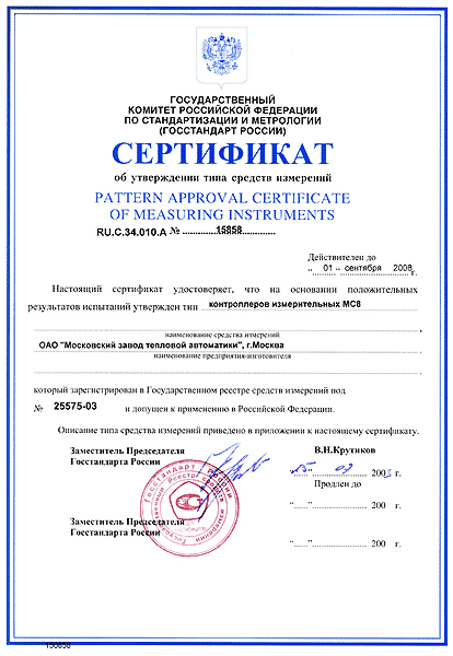 Сертификат об утверждении типа средств измерений Госстандарта России контроллеров измерительных MC8