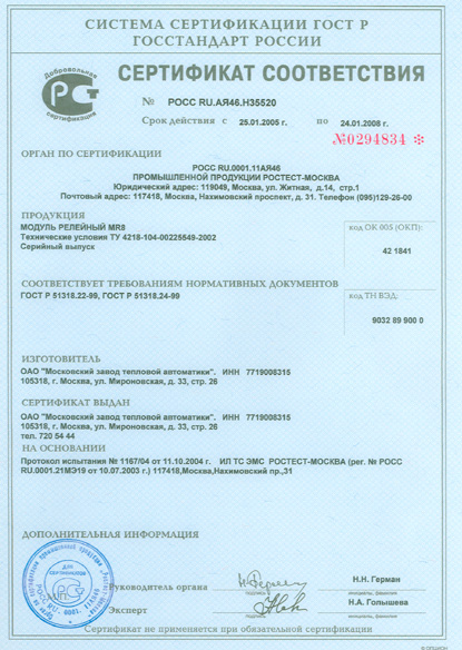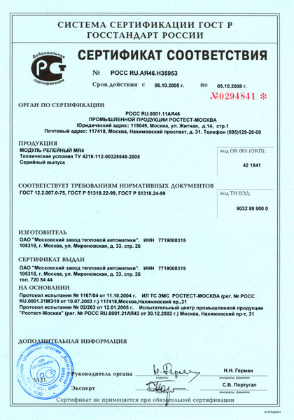 Сертификат соответствия Госстандарта России на модуль релейный MR4