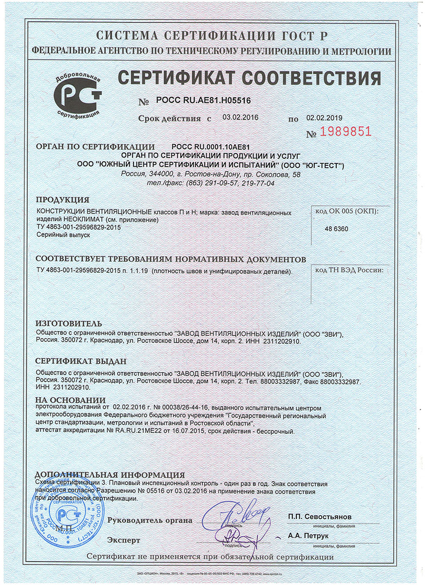 Сертификат соответствия на конструкции вентиляционные классов П и Н, марка Неоклимат