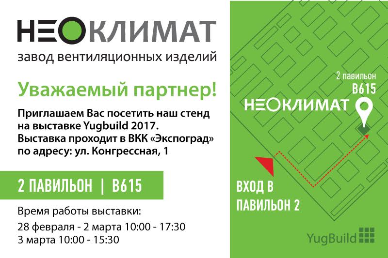 Завод «Неоклимат» примет участие в выставке «Югбилд-2017»Рады сообщить Вам, что завод вентиляционных изделий «Неоклимат» примет участие в международной выставке строительных и отделочных материалов, инженерного оборудования и архитектурных проектов «Югбилд-2017».