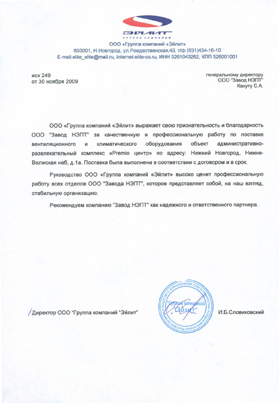 Руководство ООО «Группа компаний«Эйлит» высоко ценит профессиональную работу всех отделов ООО «Завода НЭПТ», которое представляет собой на наш взгляд, стабильную организацию.