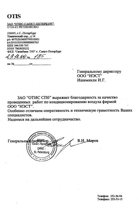 ЗАО «ОТИС СПб» выражает благодарность за качество проведенных работ по кондиционированию воздуха фирмой ООО «НЭСТ».