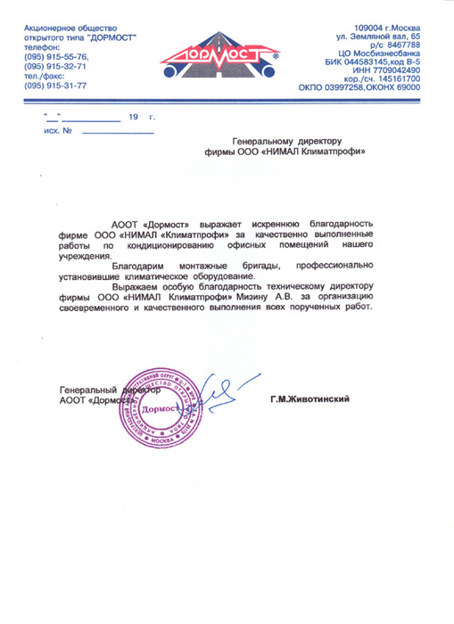 АООТ "Дормост" выражает искреннюю благодарность фирме ООО "НИМАЛ "Климатпрофи" за качественно выполненные работы по кондиционированию офисных помещений нашего учреждения.
