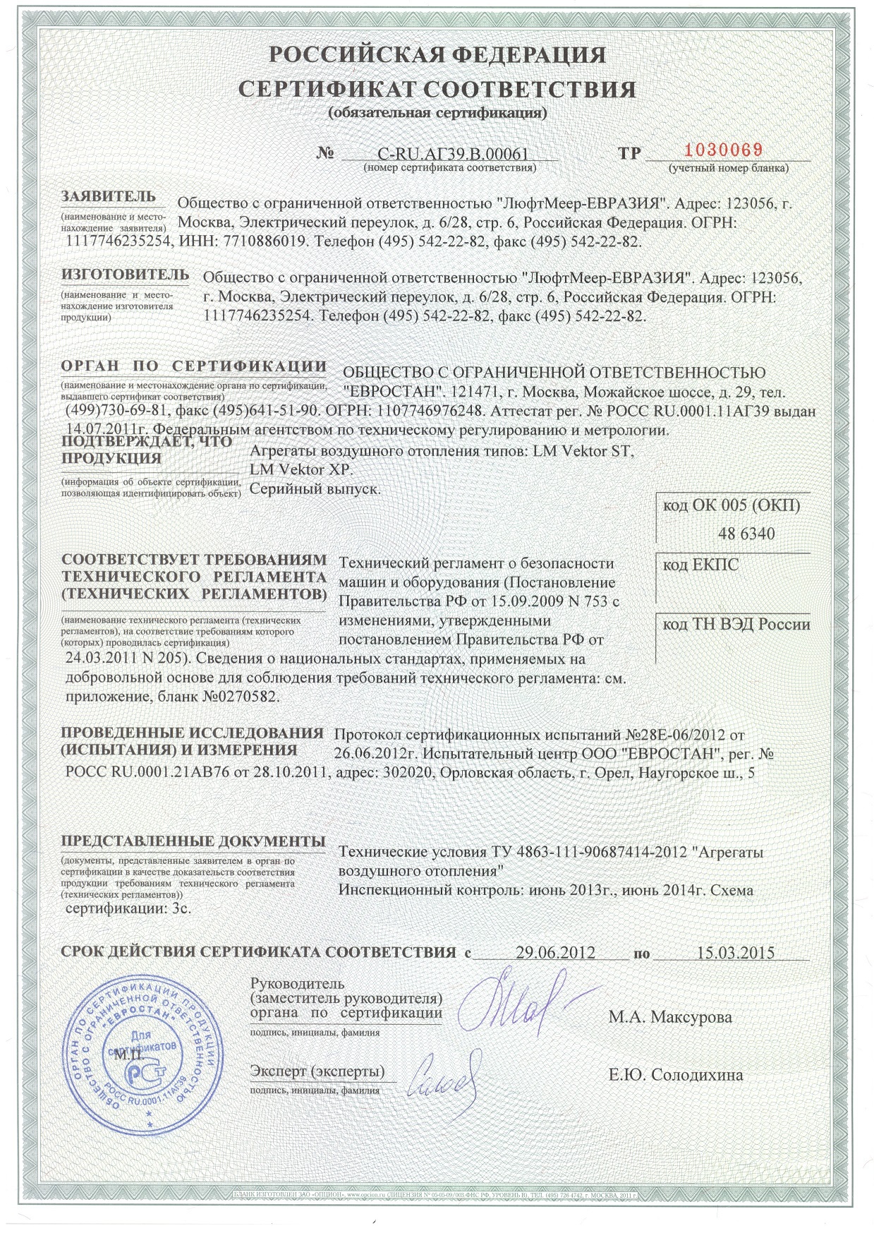 Сертификат соответствия на агрегаты воздушного отопления типов- LM Vektor ST, LM Vektor XP
