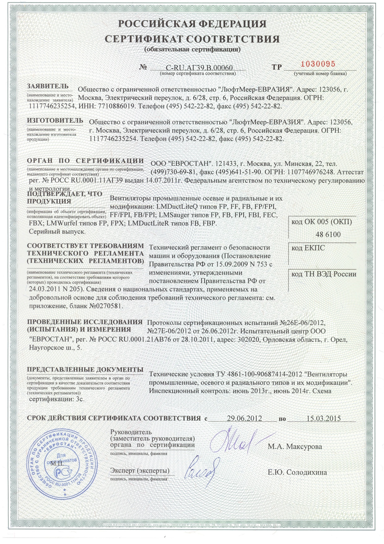Сертификат соответствия на вентиляторы промышленные осевые и радиальные - LMDuctLiteQ, LMSauger, LMWurfel, LMDuctLiteR