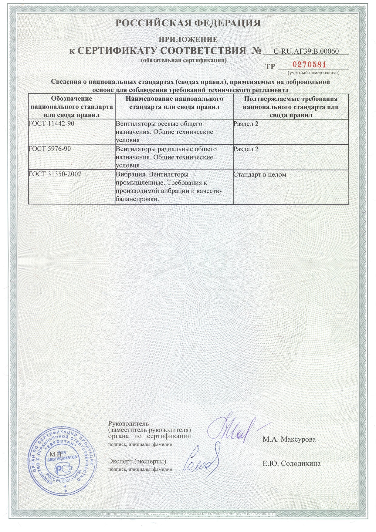 Приложение к сертификату соответсвия на вентиляторы промышленные осевые и радиальные - LMDuctLiteQ, LMSauger, LMWurfel, LMDuctLiteR