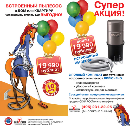Только этим летом компания «ОКНА РОСТА», эксклюзивный дистрибьютор централизованных систем пылеудаления VACUFLO и ENKE в России и странах СНГ, проводит уникальную Акцию! Полный комплект встроенного пылесоса всего за 19 990 рублей!