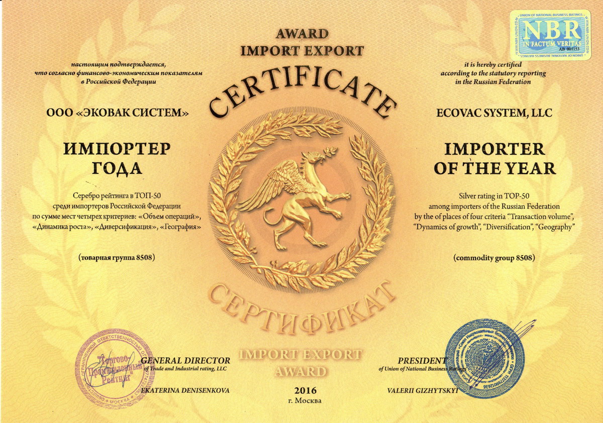 Как подтверждение значительного вклада в развитие внешнеэкономической области и экономики в целом, высоких стандартов продукции и услуг, высоких показателей внешнеэкономической деятельности и высокого уровня ведения бизнеса, а также надежности компании-импортера - компании «ЭКОВАК СИСТЕМ» были вручены медаль и сертификат «Импортер года».