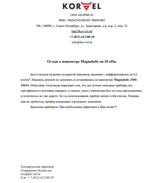 Долго искали на рынке недорогой манометр давления с дифференциалом до 0,2 кгс/см². Наконец, решили не дешевить и остановились на манометре Magnehelic 2000-20kPa. Менеджер Александр порадовал тем, что дал полное описание прибора, все сертификаты и методику поверки, а главное, цена у манометра была по спецпредложению, и получилось не так дорого. За год использования, прибор окупил себя сполна. Поверка нам не требуется, прибор показывает в разумных значениях.