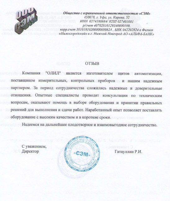 Компания «ОЛИЛ» является изготовителем щитов автоматизации, поставщиком измерительных, контрольных приборов и нашим надежным партнером. За период сотрудничества сложились надежные и доверительные отношения. Опытные специалисты проводят консультации по техническим вопросам, оказывают помощь в выборе оборудования и принятии правильных решений для выполнения и сдачи работ. Наработанный опыт позволяет поставлять оборудование с высоким качеством и в короткие сроки.