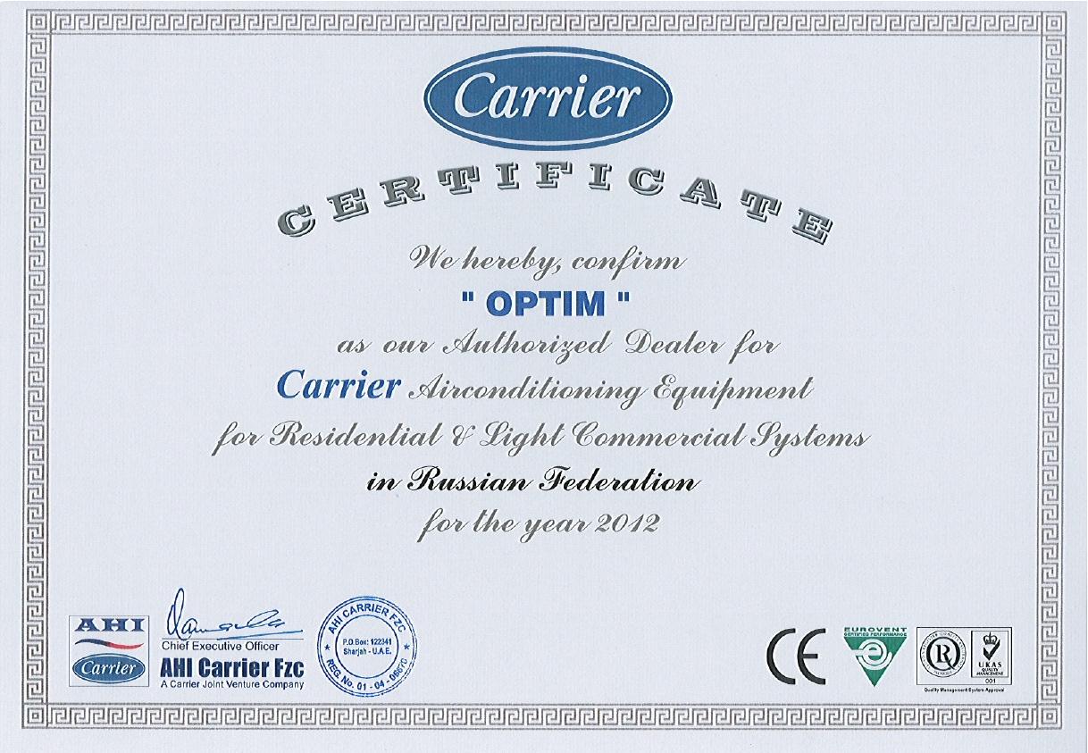Сертификат официального дистрибьютора бренда Carrier на территории России