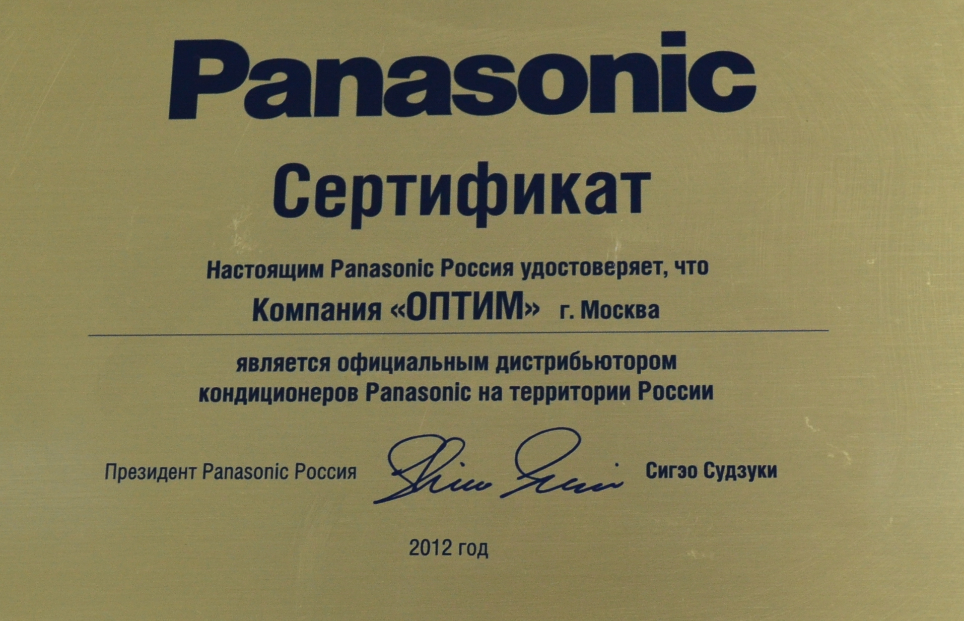 Сертификат официального дистрибьютора кондиционеров Panasonic на территории России