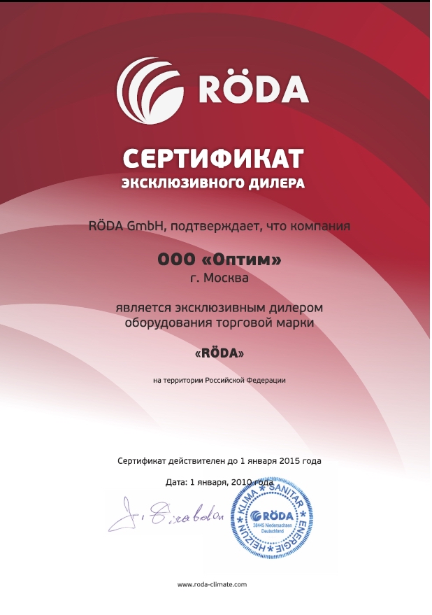 Сертификат официального дистрибьютора оборудования Roda на территории Российской Федерации