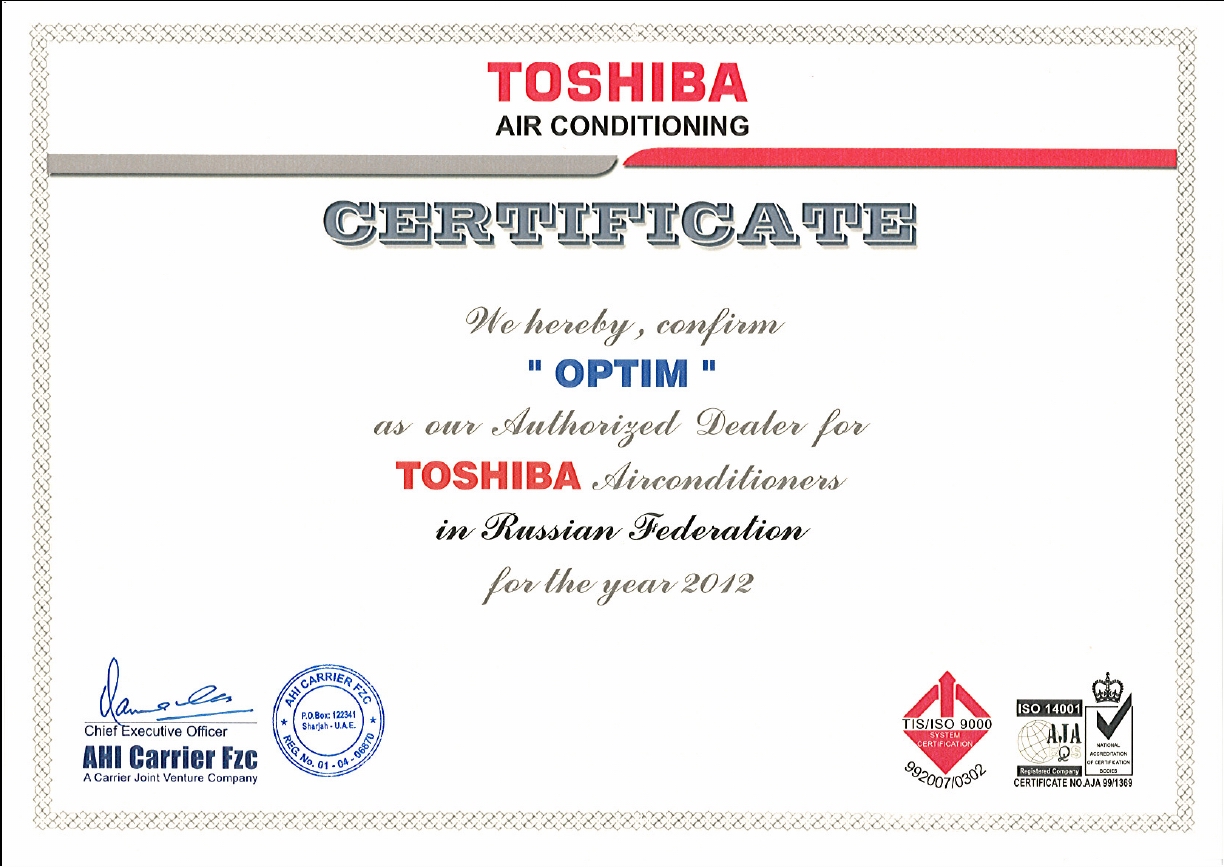 Сертификат официального дистрибьютора бренда Toshiba на территории России