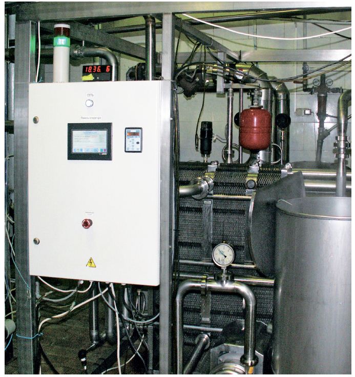 Разработкой системы управления занималась вологодская компания ПРОЕКТ-П. С помощью панели оператора ОВЕН СП270 управление исполнительными механизмами ППОУ осуществляется как в автоматическом, так и в ручном режимах, причем переключение с автоматического на ручное управление возможно непосредственно во время работы установки. В зависимости от технологии обработки продукта возможно использование любой комбинации оборудования ППОУ: выдерживателя, деаэратора, сепаратора, гомогенизатора. На «Вологодском молочном комбинате» установлены две пастеризационные установки: для сливок и соляных растворов. Результатом эксплуатации этих установок стало отличное качество получаемого продукта и надежная работа системы управления.