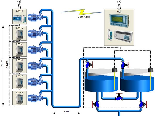 АСУ осуществляет работу насосов артезианских скважин, которые находятся на расстоянии 6 км друг от друга, при этом насосы находятся между собой на расстоянии 100-150 метров и между ними проложен информационный кабель (витая пара). Управление включением насосов осуществляется через насосную станцию. АСУ состоит из главного шкафа управления насосами ШУН-1 и шести подчиненных ШУН-2…ШУН-6, а также диспетчерского шкафа ШД, управляющего работой всех остальных шкафов.