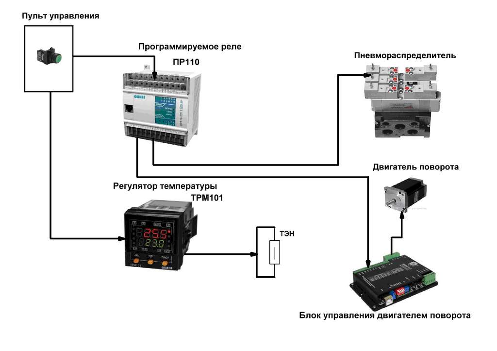 Все перемещения механизмов машины для склеивания картонных коробок обеспечиваются с помощью пневмоцилиндров, управляемых пневмораспределителями с электрическим управлением. Применение недорого и простого в управлении и эксплуатации программируемого реле ОВЕН ПР110-24.12Д.8Р позволило осуществить автоматическое управление всем циклом работы. Нагревом плиты завальцовочного пресса управляет регулятор температуры ОВЕН ТРМ101 – он поддерживает постоянную температуру плиты. Поворот стола для нанесения клея на донце осуществляется шаговым двигателем с системой управления. Скорость поворота и угол поворота задается с системы управления шаговым двигателем. Нанесение клея осуществляется специальной клеевой машиной, подающей клей к месту нанесения через клеевую форсунку. Для обеспечения безопасности оператора пуск цикла осуществляется одновременным нажатием двух кнопок «Пуск» обеими руками одновременно.