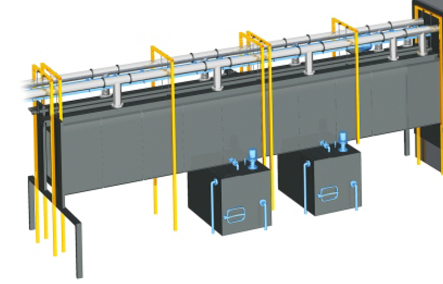 Бокс химической подготовки поверхности (промышленная тактовая моечная установка) предназначен для подготовки поверхности металлических изделий перед нанесением защитно-декоративных покрытий. Подготовка поверхности выполняется путем последовательного распыления под давлением на поверхность изделий, сначала нагретых до определенной температуры обезжиривающих составов, затем промывкой поверхности изделий чистой водой.