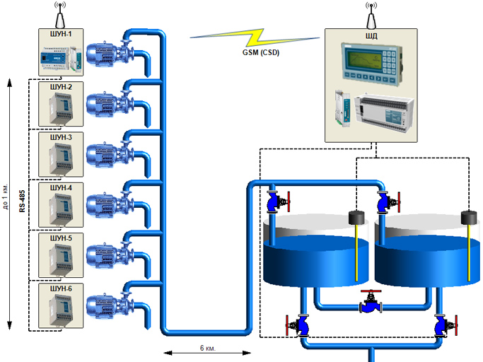Работы по автоматизации управления скважинными насосами по уровню в резервуарах чистой воды (РЧВ) через GSM-канал в поселке Шамонино Республики Башкортостан осуществила компания «УралАвтоматика» (г. Уфа). Суть системы управления следующая. Созданы несколько шкафов управления: главный шкаф управления ШУН1, подчиненные шкафы управления ШУН-2…ШУН-6 и диспетчерский шкаф ШД, управляющий работой всех остальных шкафов.
