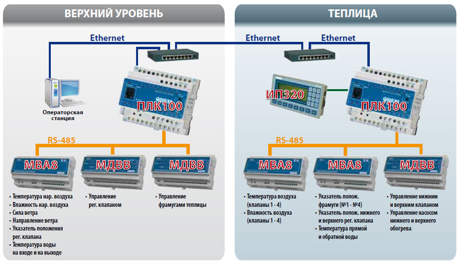 Созданная система управляет автоматическим открытием фрамуг, закрытием термостатов, снижением скорости работы циркуляционных насосов, тем самым создается необходимый микроклимат в теплицах для выращивания овощей. Распределенная система управления представляет собой двухуровневую сетевую структуру. Первый уровень объединяет программируемые контроллеры ОВЕН ПЛК100 (по одному на каждую теплицу) с контроллером верхнего уровня (ПЛК100), операторской станцией и модулями дискретного ввода/вывода ОВЕН МДВВ по сети Ethernet. Второй уровень АСУ реализован на основе модулей ввода/вывода ОВЕН МВА8, операторской панели ОВЕН ИП320, датчиков температуры, других устройств и интерфейса RS-485/RS-232. Полевая сеть построена с несколькими линиями передачи данных.