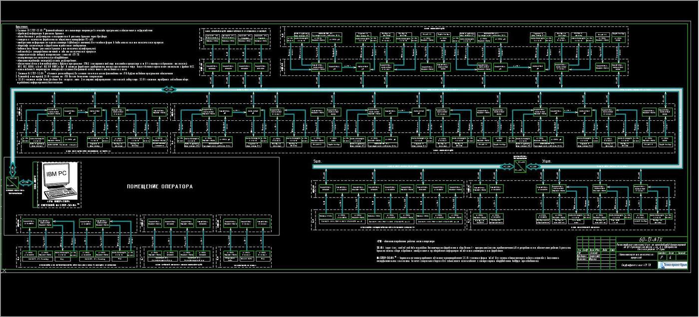 Компания «Проектная группа» (г. Симферополь, Республика Крым) автоматизировала на базе оборудования ОВЕН цех по производству биопрепаратов. Технологический процесс в цехе разделен на 9 технологических блоков и каждый из них имеет свою систему автоматизации. В состав каждой системы автоматизации входят первичные и вторичные преобразователи. В состав системы управления входят измерители-регуляторы с RS-485 ОВЕН ТРМ201, измерители с RS-485 ОВЕН ТРМ200, измерители ПИД-регуляторы для управления задвижками и трехходовыми клапанами с интерфейсом RS-485 ОВЕН ТРМ212, датчики давления ПД100, датчики температуры типа ДТПL(ХК) и ДТПK(ХА), преобразователи интерфейсов АС3-М, АС5 и др. Средства контроля с местным отсчетом параметров и первичные преобразователи параметров с дистанционной передачей информации устанавливаются по месту на технологическом оборудовании каждого блока. Вторичные преобразователи, аппараты управления исполнительными механизмами помещаются в местном шкафу управления (МЩУ) каждого блока. Все МЩУ технологических блоков подключены к общей шине данных промышленной сети с возможностью передачи данных по RS-485 (протоколы ОВЕН, ModBus RTU или ModBus ASCII). Данные поступают на АРМ оператора. Функцию АРМ выполняет персональный компьютер с установленным программным обеспечением SCADA-системы, которая является верхним уровнем АСУ.