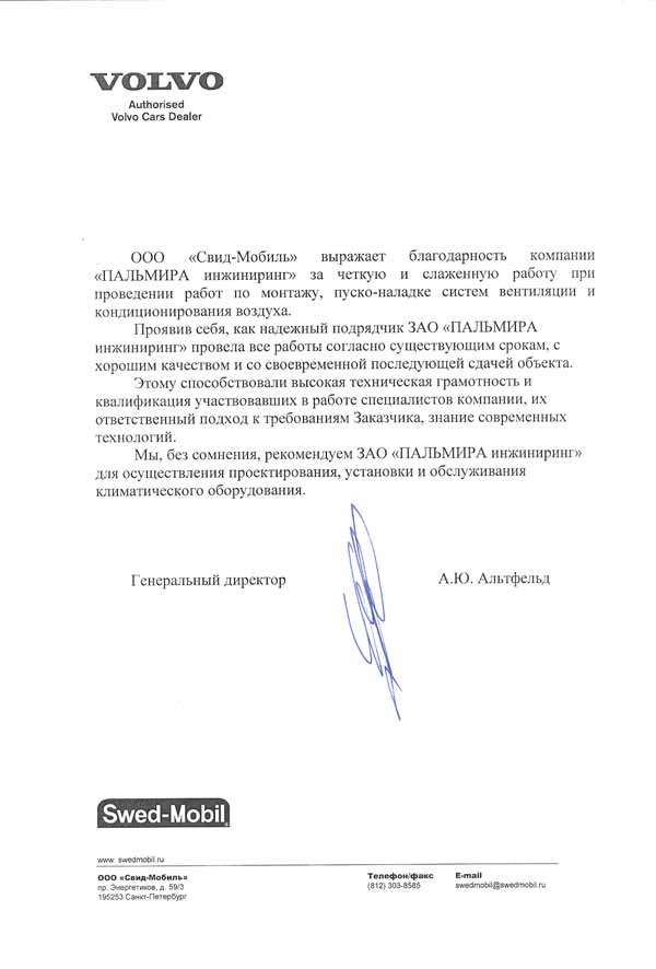OOO «Свид-Мобиль» выражает благодарность компании «ПАЛЬМИРА инжиниринг» за четкую и слаженную работу при проведении работ по монтажу, пуско-наладке систем вентиляции и кондиционирования воздуха.