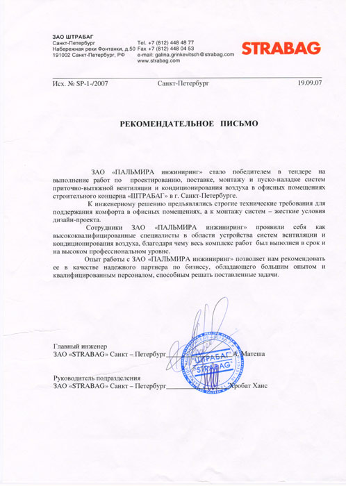 ЗАО «ПАЛЬМИРА инжиниринг» стало победителем в тендере на выполнение работ по проектированию, поставке, монтажу и пуско-наладке систем приточно-вытяжной вентиляции и кондиционирования воздуха в офисных помещениях строительного концерна «ШТРАБАГ» в г. Санкт-Петербурге.