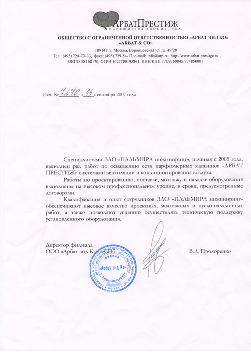 Специалистами ЗАО «ПАЛЬМИРА инжиниринг», начиная с 2005 года, выполнен ряд работ по оснащению сети парфюмерных магазинов «АРБАТ ПРЕСТИЖ» системами вентиляции и кондиционирования воздуха.