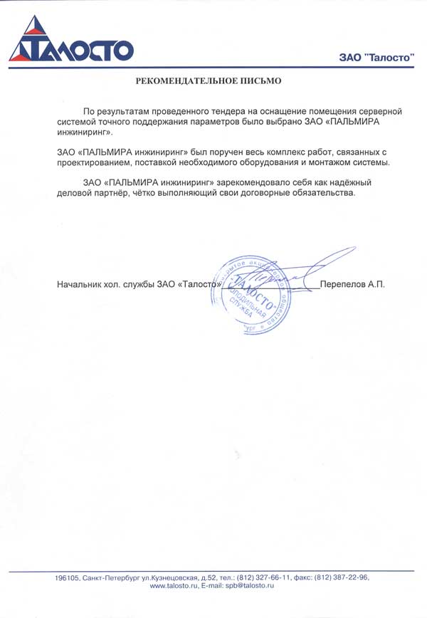 ЗАО «ПАЛЬМИРА инжиниринг» зарекомендовало себя как надёжный деловой партнёр, чётко выполняющий свои договорные обязательства.