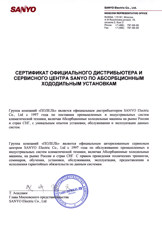 Сертификат официального дистрибьютора и сервисного центра Sanyo