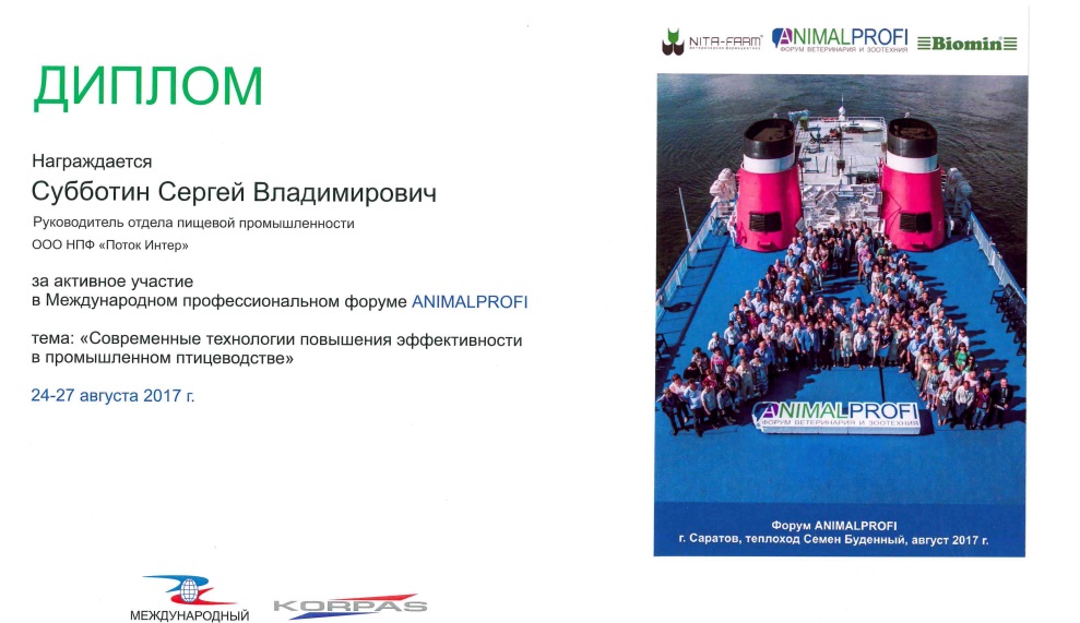 Сергей Субботин, руководитель отдела пищевой промышленности ООО НПФ «Поток Интер», 24-27 августа принял участие в Международном профессиональном форуме ANIMALPROFI, посвященном современным технологиям повышения эффективности в промышленном птицеводстве.