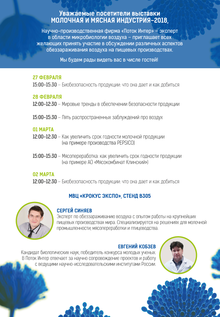 С 27 февраля по 2 марта «Поток Интер», эксперт в области микробиологии воздуха, организует мастер-классы по улучшению качества воздуха на пищевых предприятиях. Мероприятия пройдут в рамках выставки «Молочная и мясная индустрия» в МВЦ «Крокус Экспо», стенд B305 (павильон 3, зал 13).