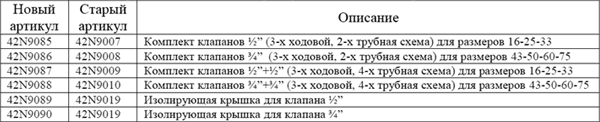 В таблице указаны изменения артикулов клапанов для фанкойлов 42N: