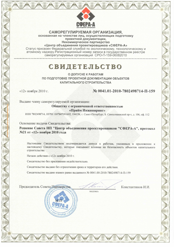 Компания «Прайм Инжиниринг» вступила в СРО НП «Центр объединения проектировщиков «СФЕРА-А» и получила получила допуск СРО к работам по подготовке проектной документации объектов капитального строительства.