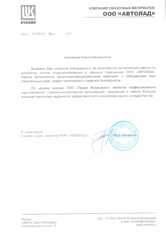 Выражаю Вам огромную благодарность за качественно выполненные работы по устройству систем кондиционирования в офисных помещениях ООО «АВТОЛАД». Работы выполнялись высококвалифицированными рабочими, с соблюдением всех строительных норм, правил технической и пожарной безопасности.