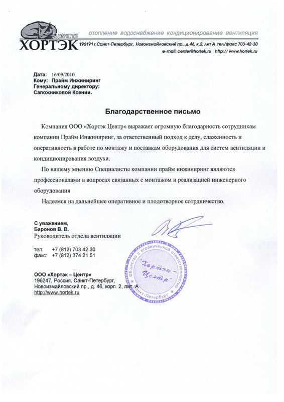 Компания ООО «Хортэк Центр» выражает огромную благодарность сотрудникам компании Прайм Инжиниринг за ответственный подход к делу, слаженность и оперативность в работе по монтажу и поставкам оборудования для систем вентиляции и кондиционирования воздуха.