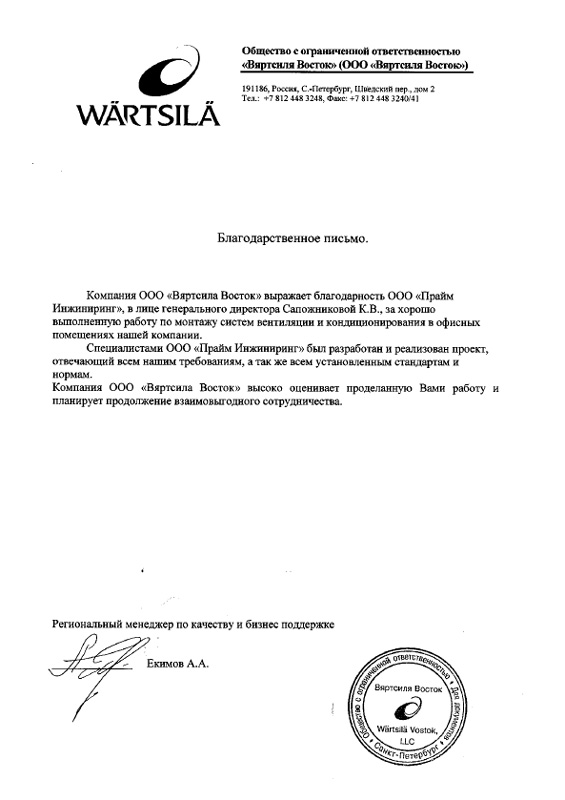 Компания ООО «Вяртсила Восток» выражает благодарность ООО «Прайм Инжиниринг», в лице генерального директора Сапожниковой К.В., за хорошо выполненную работу по монтажу систем вентиляции и кондиционирования в офисных помещениях нашей компании.