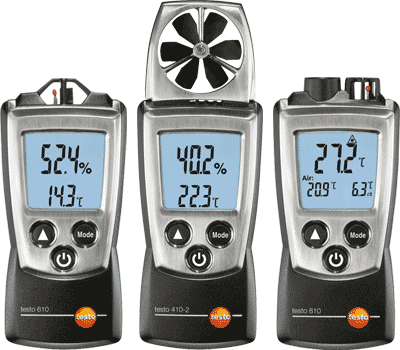 Testo 410-1: Анемометр с крыльчаткой, со встроенным NTC сенсором измерения температуры воздуха. Измеряет скорость потока и температуру воздуха. Прибор идеально подходит для точечных измерений на выходах воздуховодов с помощью встроенной крыльчатки D 40 мм. Возможен расчет среднего значения измерений. В дополнение, прибор Testo 410-2 также измеряет уровень влажности воздуха.