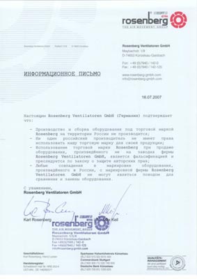 В связи с участившимися случаями выдачи оборудования, произведенного в России, за продукт Rosenberg Ventilatoren GmbH, немецкий концерн сделал информационное заявление: