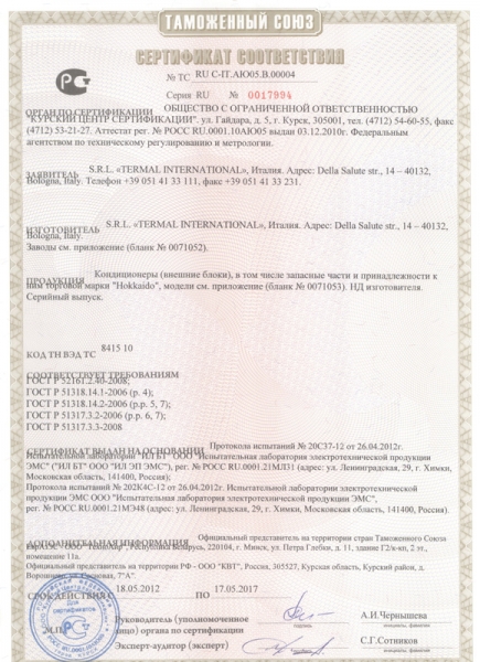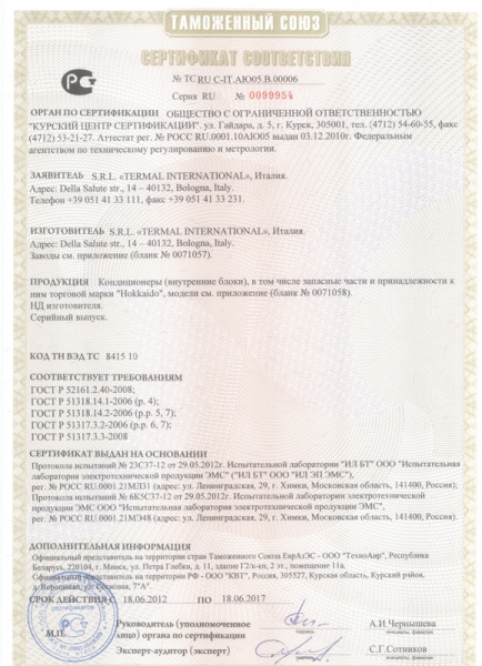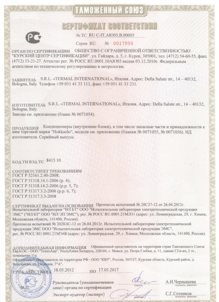 Сертификат соответствия №0017995 на кондиционеры (внешние блоки) Hokkaido