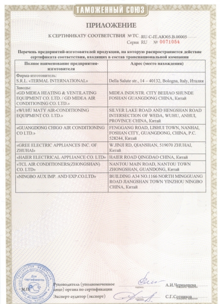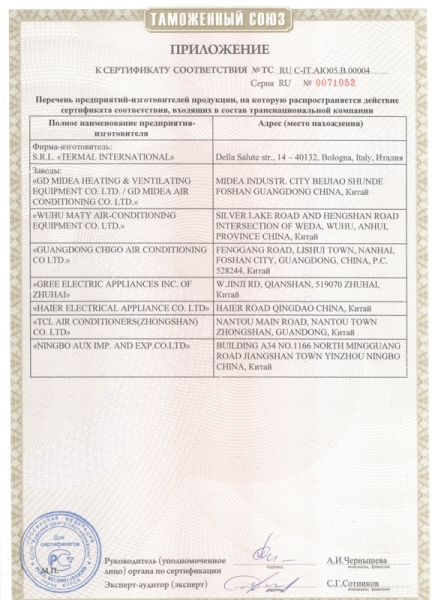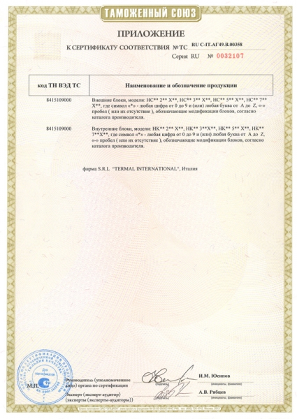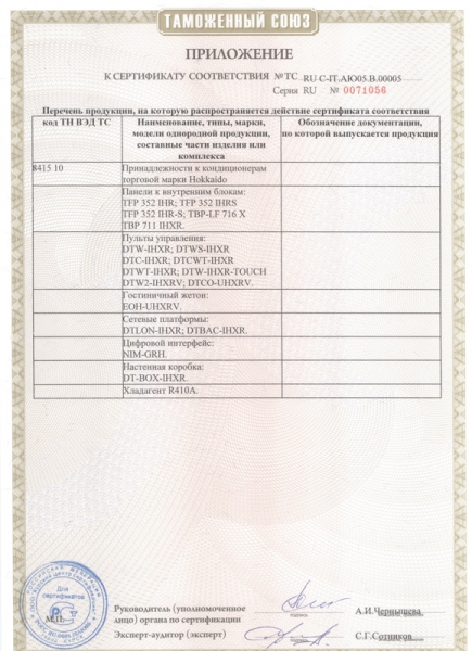 Сертификат соответствия на кондиционер Hokkaido HMCI 125 F-EH. Приложение